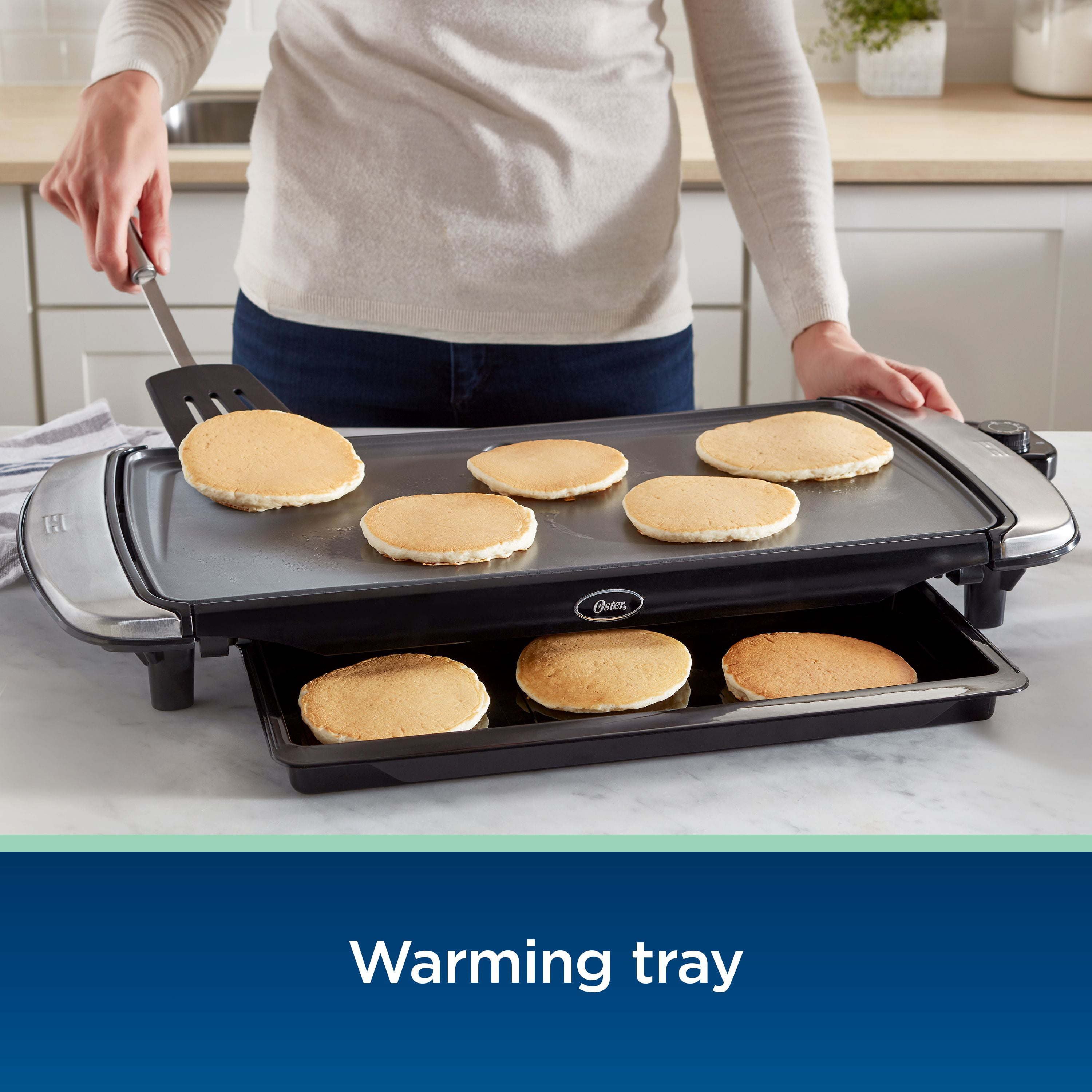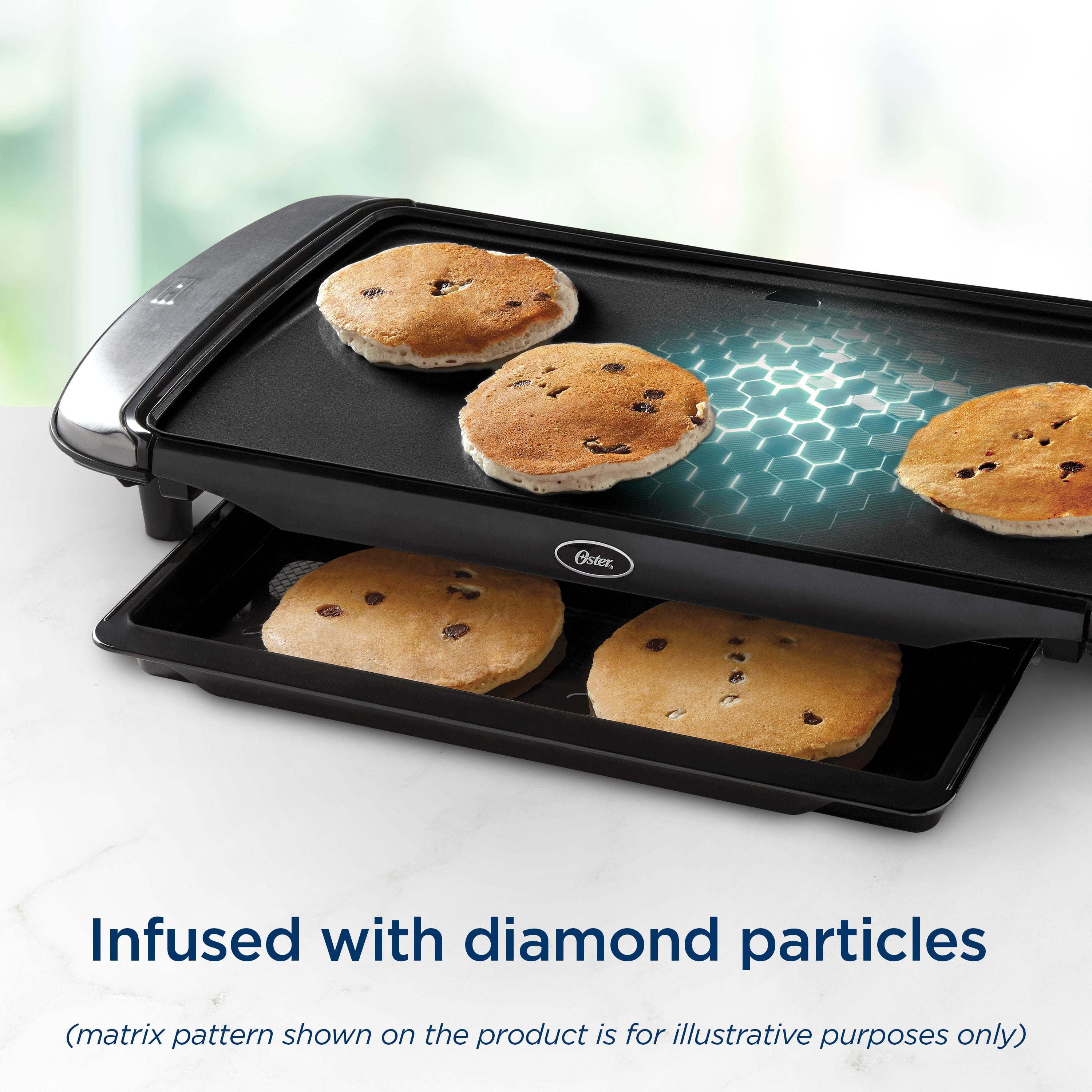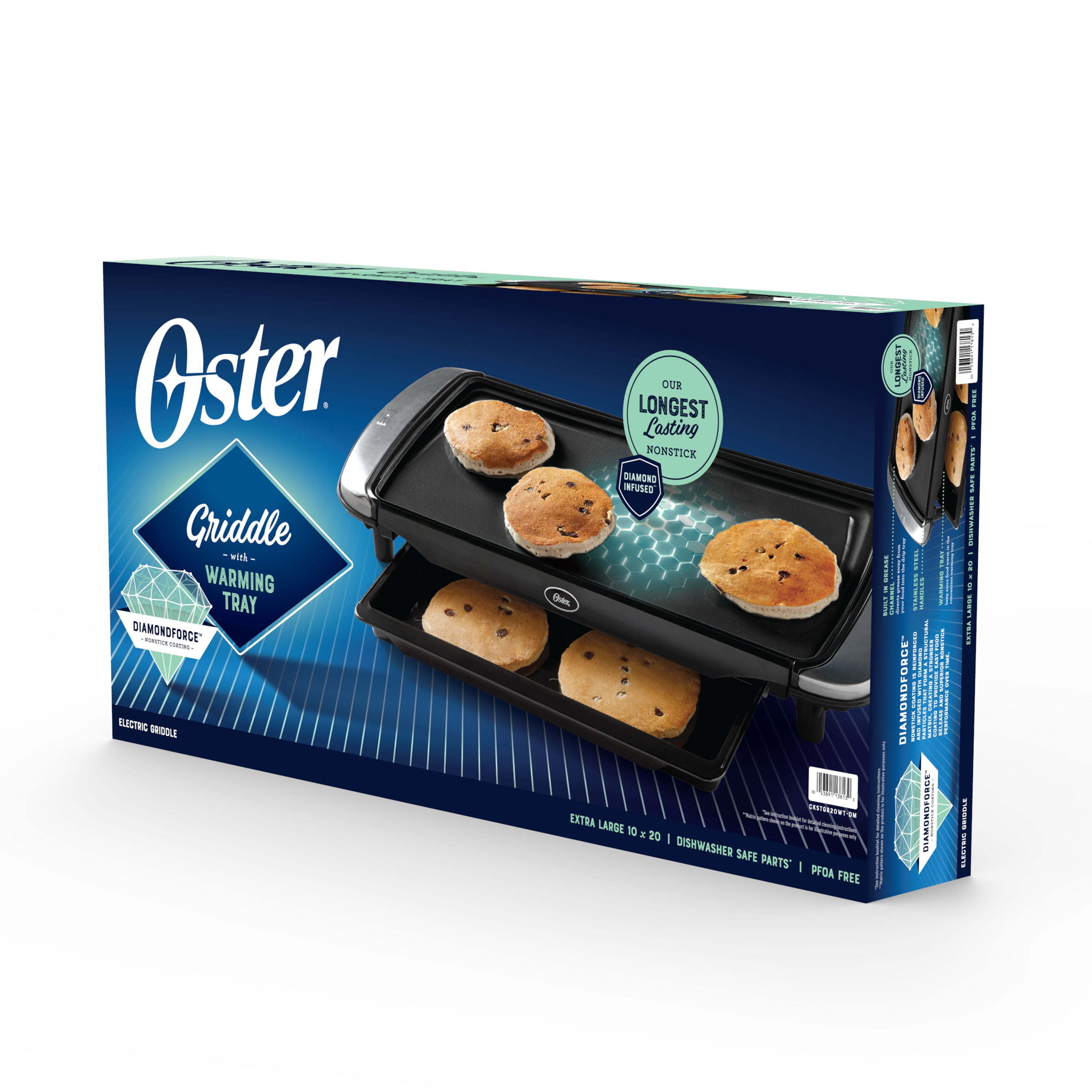Update your kitchen and cook with Oster's longest-lasting nonstick yet! This versatile electric griddle features Oster® DiamondForce™ Nonstick, infused with diamond particles that form a structural matrix, creating a stronger coating to provide easy food release and superior nonstick performance over time. Food ends up on your plate, not stuck to your pan! The easy-clean griddle features dishwasher-safe parts (see instruction booklet for detailed cleaning instructions) and is PFOA-free. It's great for breakfast and other family meals, and includes a removable warming tray so food is at the right temperature at serving time.Our longest-lasting nonstick: Update your kitchen with Oster's DiamondForce cookware. The cooking surface is reinforced and infused with diamond particles that form a structural matrix, creating a stronger coating for superior nonstick performance over time—it's Oster's longest-lasting nonstick Easier food release: Surface is designed for easy food release so food goes on your plate instead of sticking to the pan, and includes dishwasher-safe parts (See instruction booklet for detailed cleaning instructions); PFOA-free Feed a crowd: Large 10-inch by 20-inch griddle cooking surface is great for a pancake breakfast and other family meals Keep it warm: The removable warming tray helps food stay at the right temperature until you're ready to serve More convenient features: Cool-touch side handles;  removable, adjustable temperature controls; drip tray for easier cleanup With today's fast-paced lifestyle, versatility and convenience in the kitchen have never been more important. Whether you're cooking or entertaining, you can always count on your Oster appliances to deliver delicious results. From waffle makers and toaster ovens to air fryers, food choppers, personal blenders, and more, Oster delivers. No questions. No drama. Just dependable, versatile products that help you keep up with the day and feed your family and loved ones. If you're looking for inspiration in the kitchen, you've also come to the right place—be sure to check out all of our recipes, including our air fryer cookbook, our downloadable collection of 50+ juicing recipes, plus recipes for your Oster blender, and all your other favorite Oster products. From cooking to entertaining, weeknights to weekends, Oster is always there for you, and always within arm's reach, ready for whatever life calls for. Oster DiamondForce 10-Inch x 20-Inch Nonstick Electric Griddle with Warming Tray: CKSTGR20WT-DM