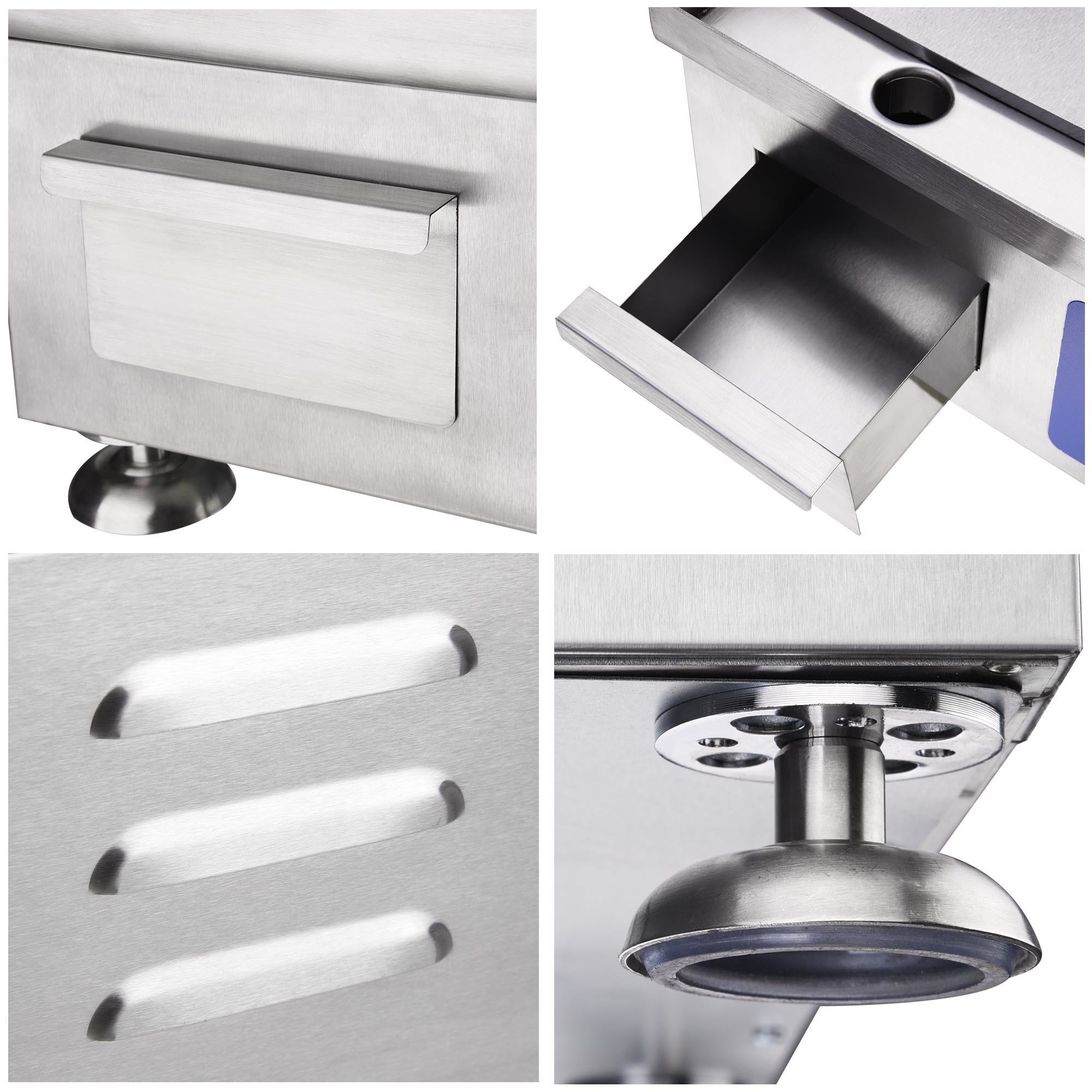 Oil Splash Protection & Easy Cleaning - Extra 2' splash guards on 3 sides protect the user from hot grease and oil splatters; Removable grease tray and smooth metal construction for easy and quick cleaning; Feet height is convenient to be adjusted for making the griddle plate incline slightly and collecting oil into grease tray