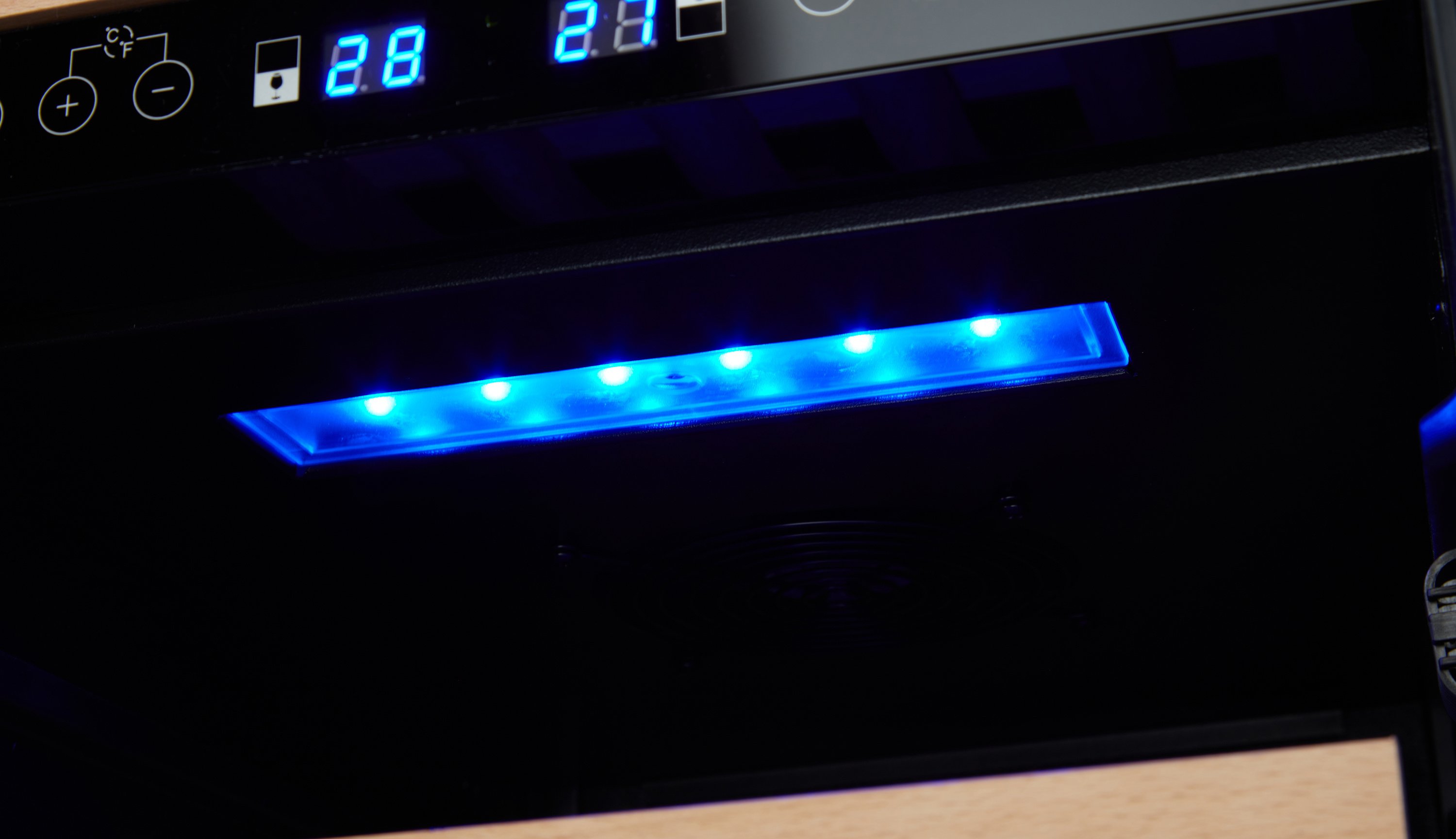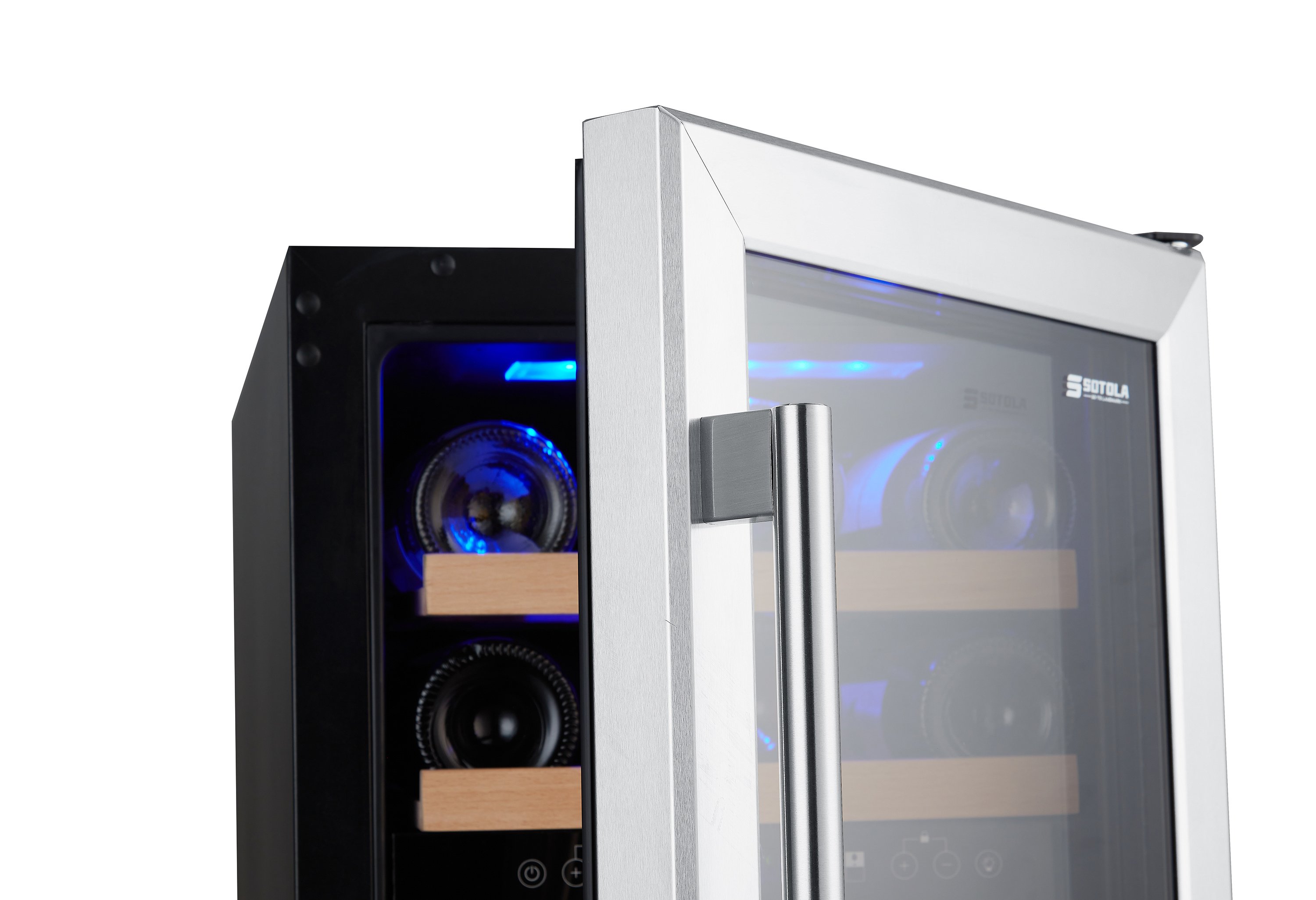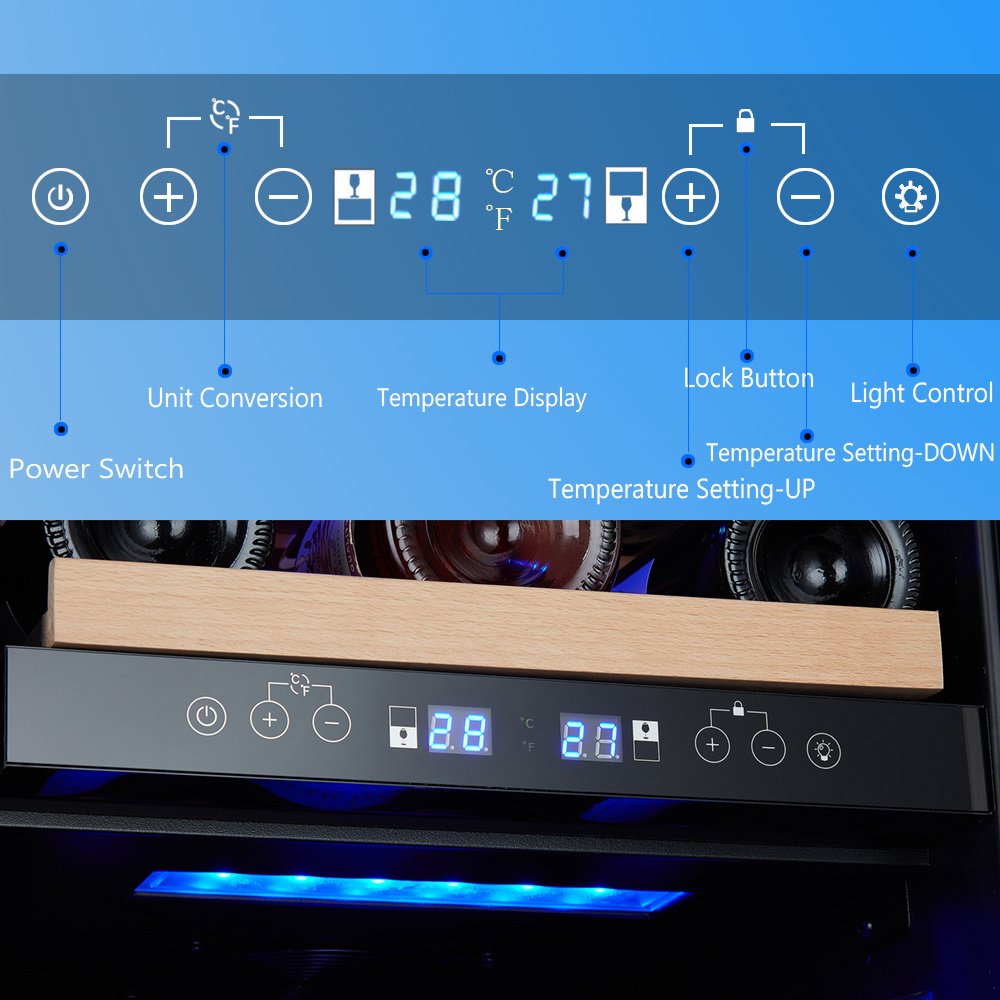Dual Zone/One-Touch Control: Featuring a space for large bottles, such as Champagne.The upper zone ranges from 41°F to 54°F while the lower zone is between 54°F to 68°F.Providing perfect chilling temperature all the time! Unique design make this small wine cooler could be installed as built-in wine cooler or freestanding one. This mini wine cooler could hold the drink you like too. You would not just enjoy your wine, could enjoy your drink too.