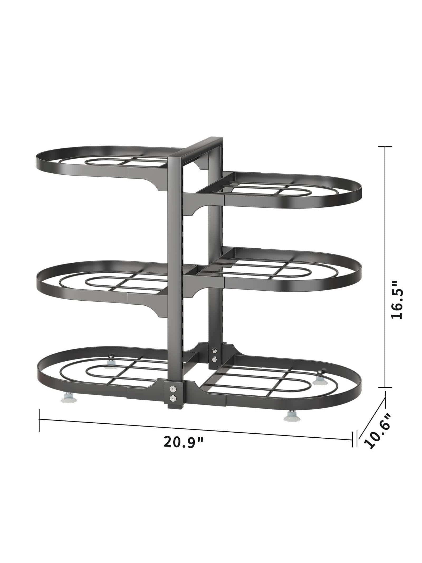 [Adjust the Height As Needed] You can adjust the height of each tier of the pot and pan organizer for cabinet so you don't need to worry about the shelves not having enough space to fit your pots. Before purchasing, measure your cabinet size and read the product dimensions carefully to make sure our adjustable pan organizer fits inside your cabinet. Please refer to the product pictures for more detailed dimensions.