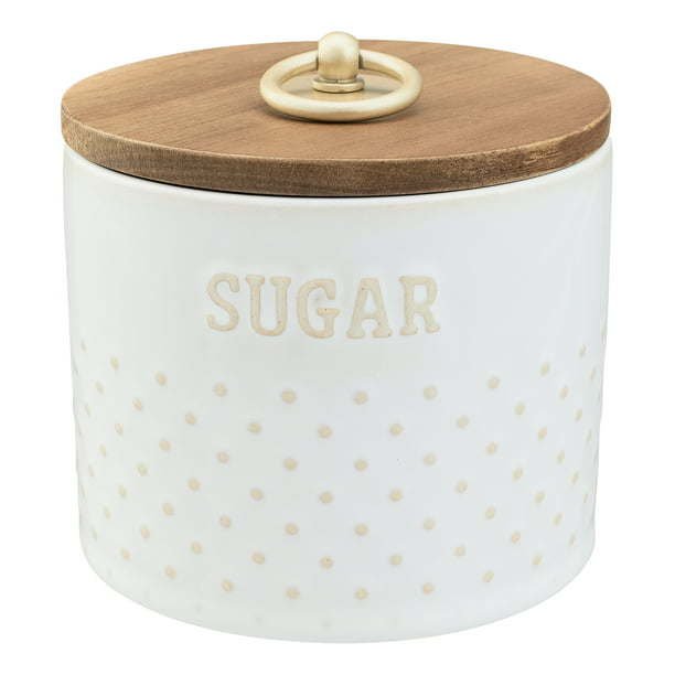 Sugar cannister with wood top measures 4.06" D x 3.66" H; holds 11.16 ounces