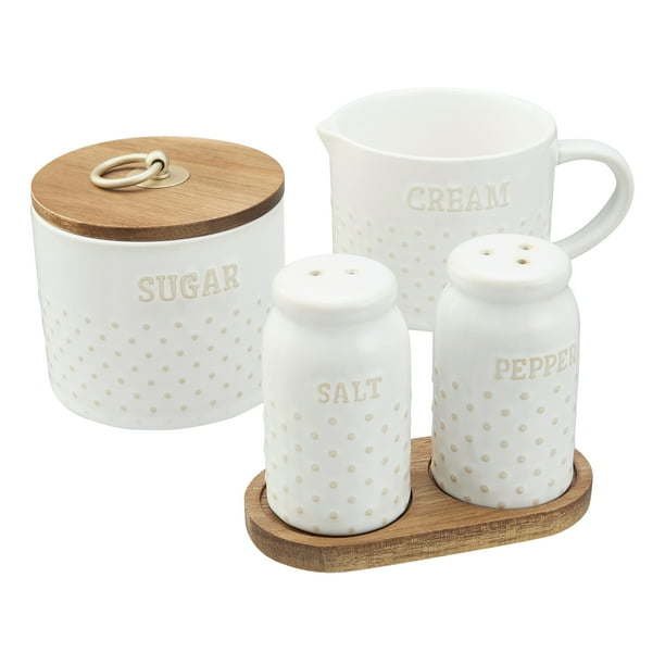 Each piece has a beautiful white reactive finish with a neutral tan dotted edging pattern. Crafted of 100% stoneware for a long life of use, the set includes a sugar cannister with a wood top and metal loop handle, a salt and pepper shaker set that stay paired on a wood holder, and a small creamer. It is a great way to start building your very own Better Homes & Gardens Farmhouse collection of (other pieces sold separately).