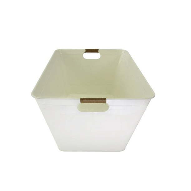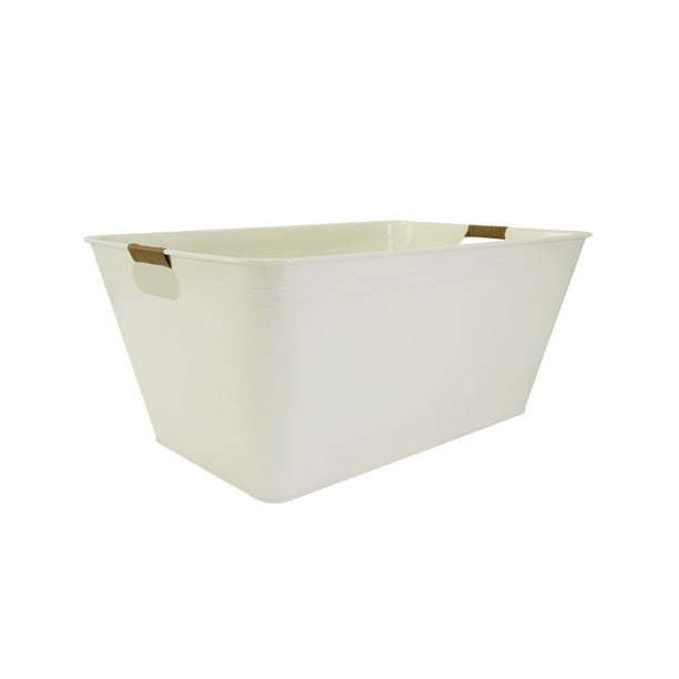 Upgrade your decor with the Better Homes & Gardens White Galvanized Rectangle Tub, size 21.96 IN L x 14.96 IN W x 10 IN H. Whether you use this for storage, creating decorative display arrangements, as a party tub to hold packaged snacks, or as an ice bucket for beverages, function meets fashion with endless possibilities. The ribbed detailing and white finish of the tub offer eye-catching appeal, matches and complements most decor styles with ease. The plastic rattan handles add a relaxed, resort-style element to the overall look while providing easy grips for you to carry from room to room — what a style score.