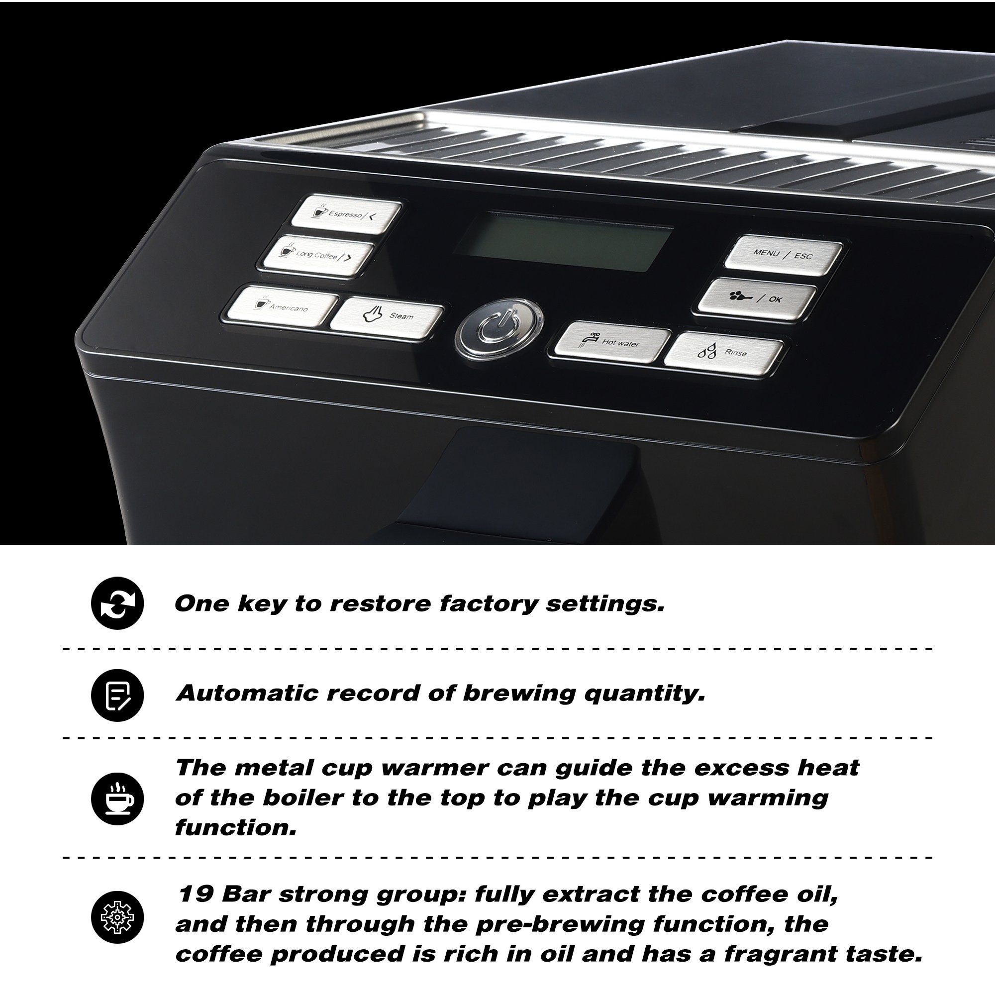 3.Versatile Functions:** Enjoy the convenience of stainless steel cup warming, automatic water and bean shortage alarms, and automatic rinsing when turning on and off.