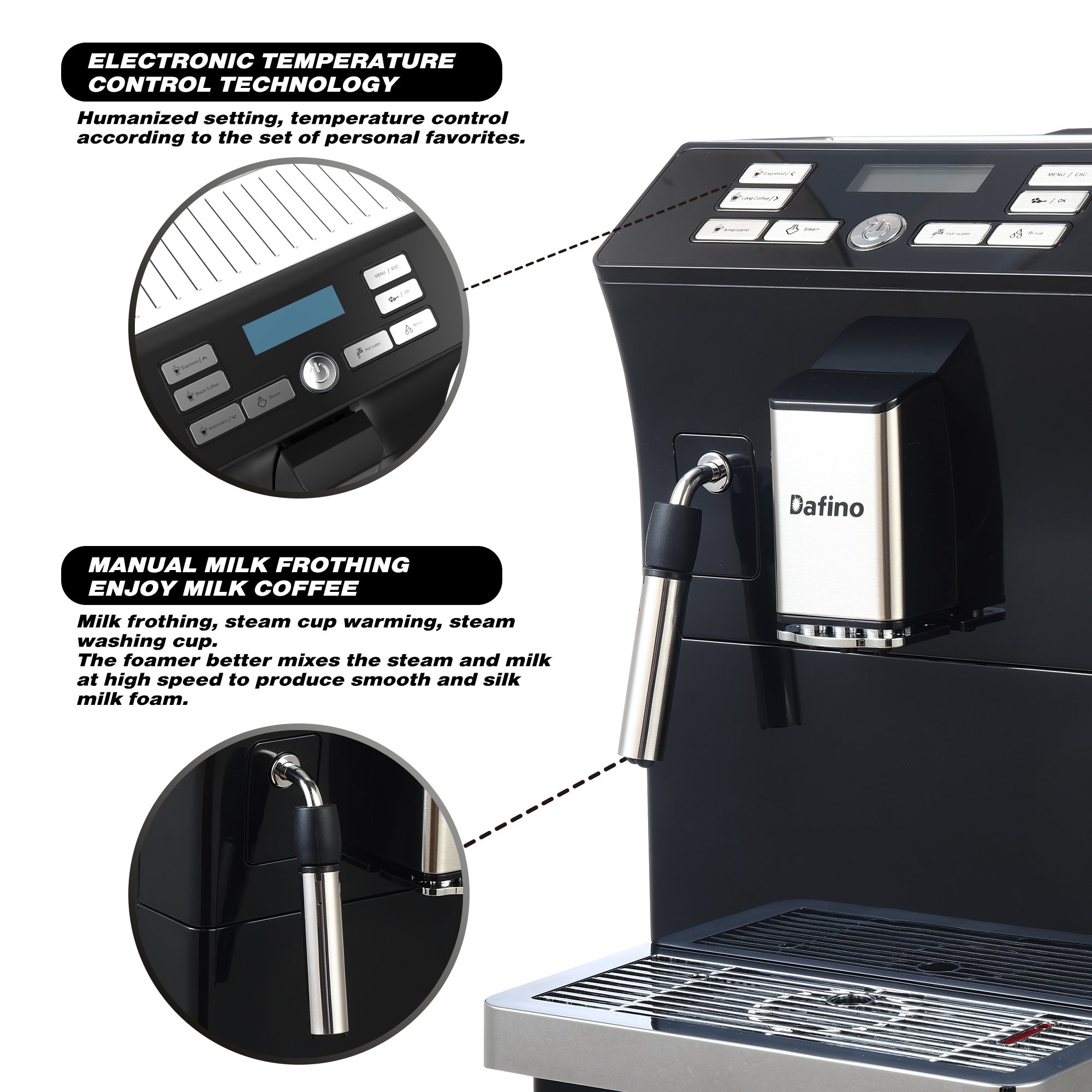 The double water pumps and boilers ensure independent coffee brewing, hot water, and milk circuits. This means your coffee, hot water, and milk are heated separately, maintaining the individual integrity of each part of your beverage. Now, you can indulge in the perfect cup every time, without any cross-contamination.