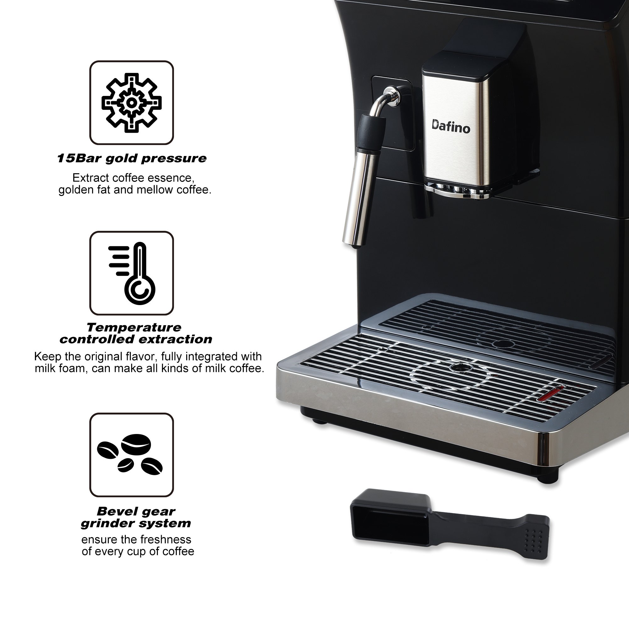One of the most prominent features is the bevel gear grinding system. This mechanism ensures the freshness of every cup of coffee you brew, extracting the full richness and fragrance of the coffee oils. The pre-brewing function results in coffee that is rich in oil and incredibly fragrant, enhancing your coffee experience.