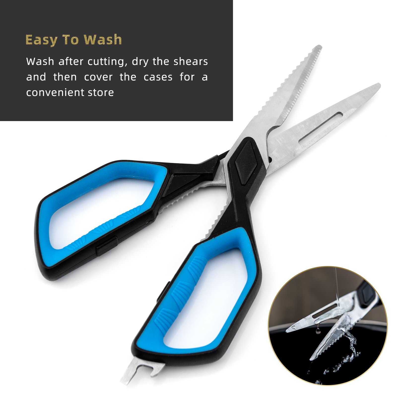 They have built-in specialty cutters for poultry (including the joints!); fish; and herbs. But it doesn't stop there; the scissor blades also include a vegetable peeler. The toothed grip between the handles is perfect for cracking larger bones or nuts. Plus; the tabs at the bottom of the handle act as a bottle opener; can opener; and even a screwdriver.