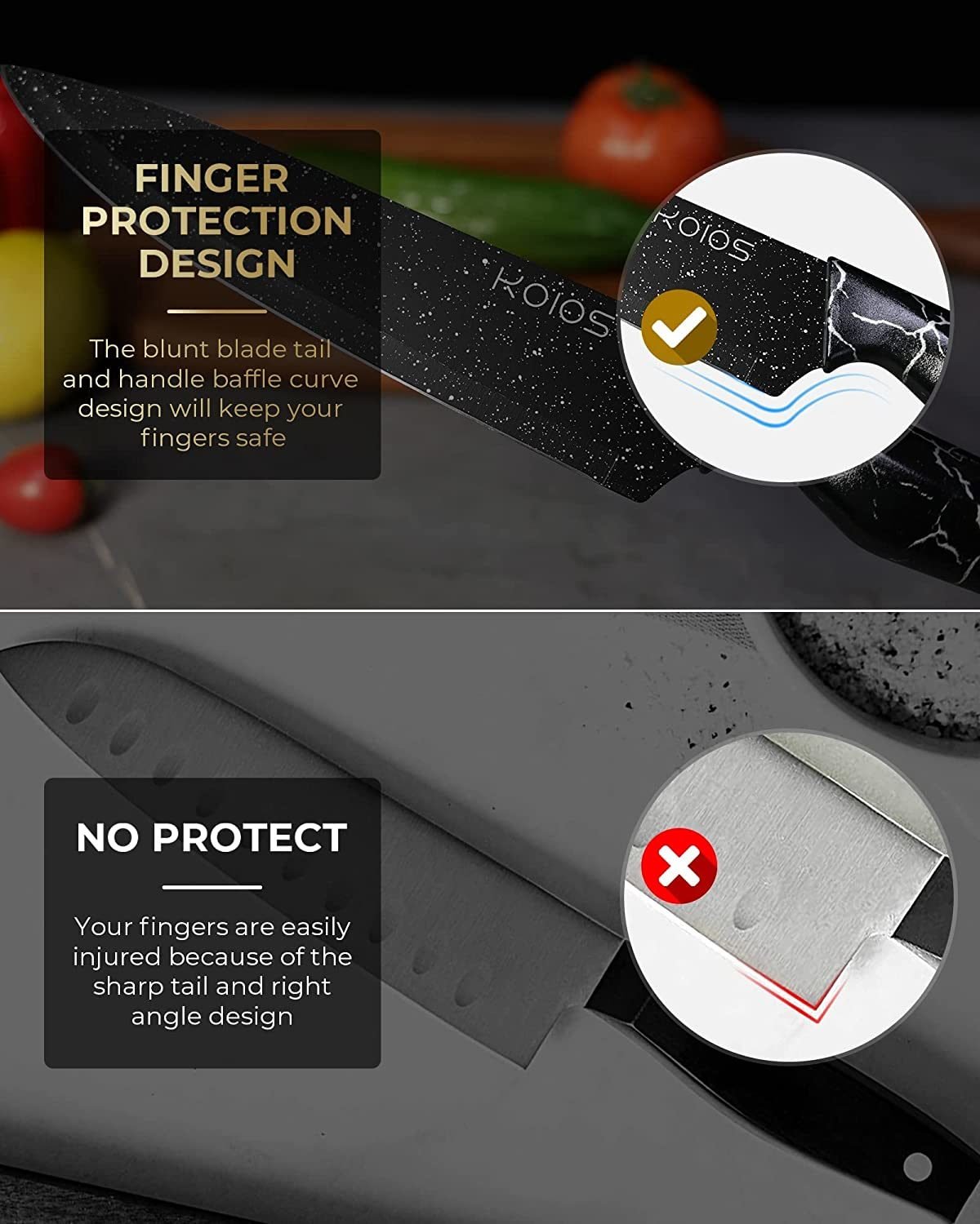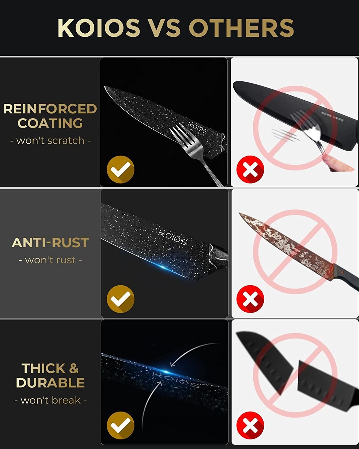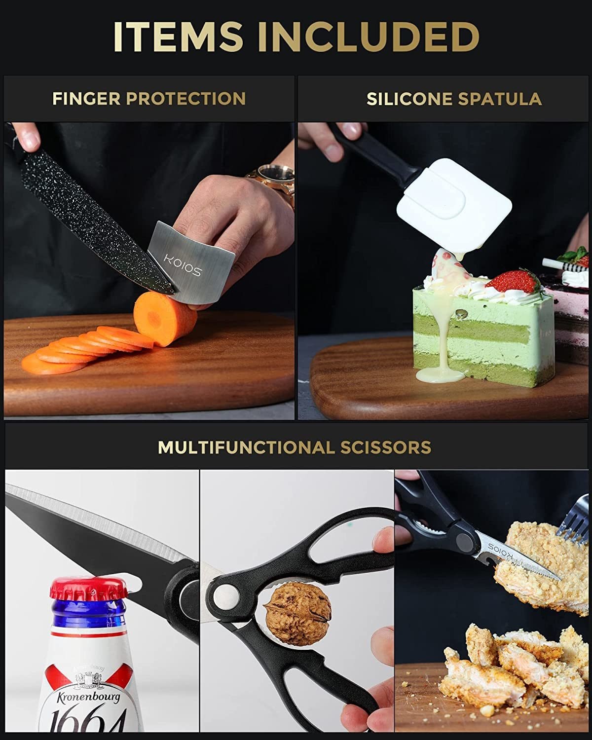 ✔About KOIOS: KOIOS brand has an extensive manufacturing expertise as well as professional R&D capabilities. Every item contributes to your lifestyle; thus we use high-quality stainless steel materials to provide customers with ultra-sharp; professional; and durable kitchen knife sets distinguished by elegance and sophistication.