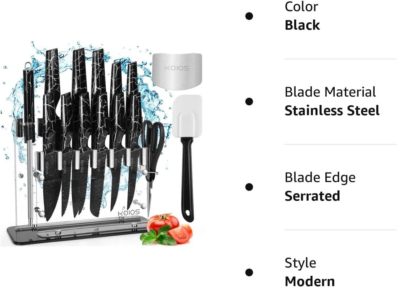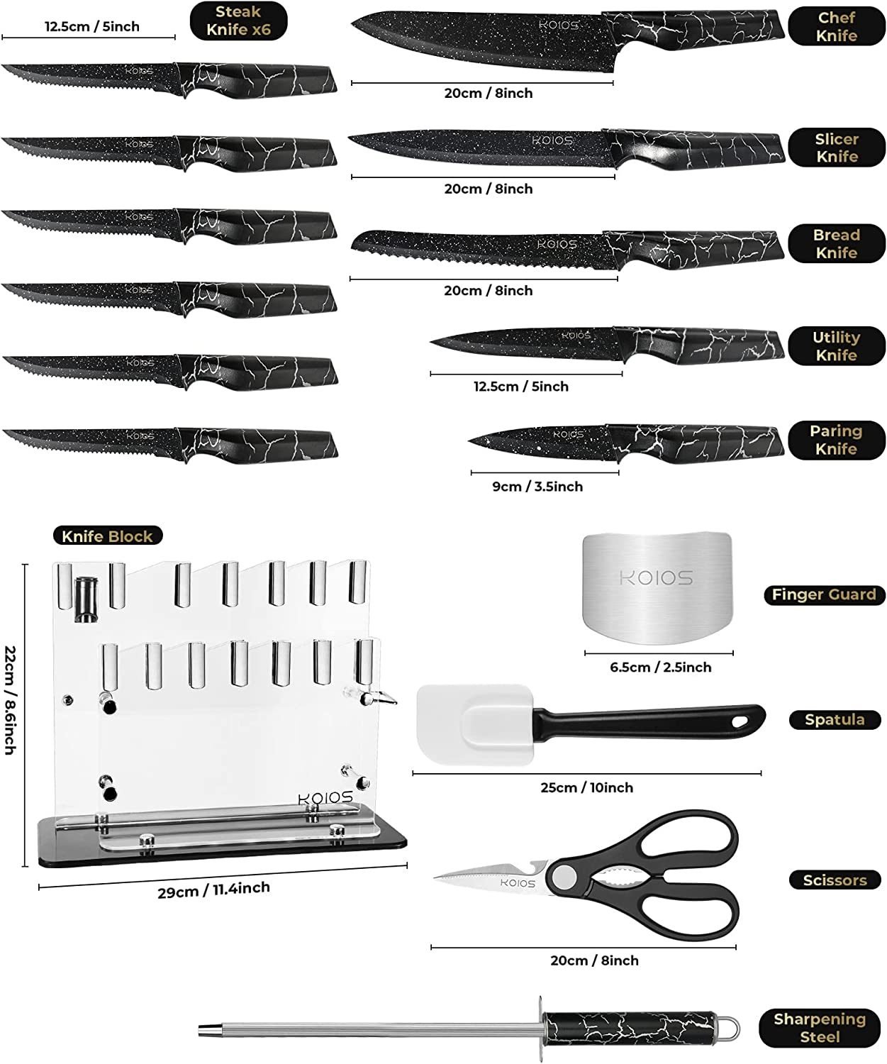 ✔Multipurpose: KOIOS 16PCS kitchen knives set include 8" chef knife; 8" slicing knife; 8" bread knife; 5" utility knife; 3.5" paring knife; 6PCS 5" steak knives; 1PCS spatula and scissors; finger guard; sharpening steel and acrylic stand. It can meet all your kitchen cooking needs. Add a touch of color to your kitchen now!