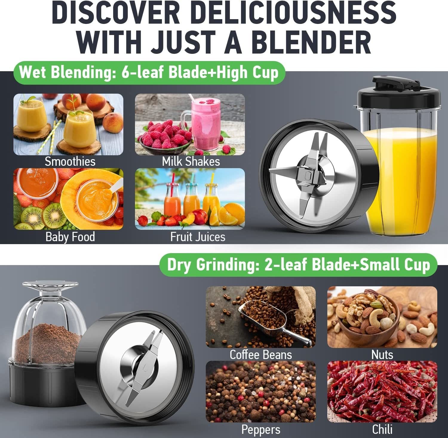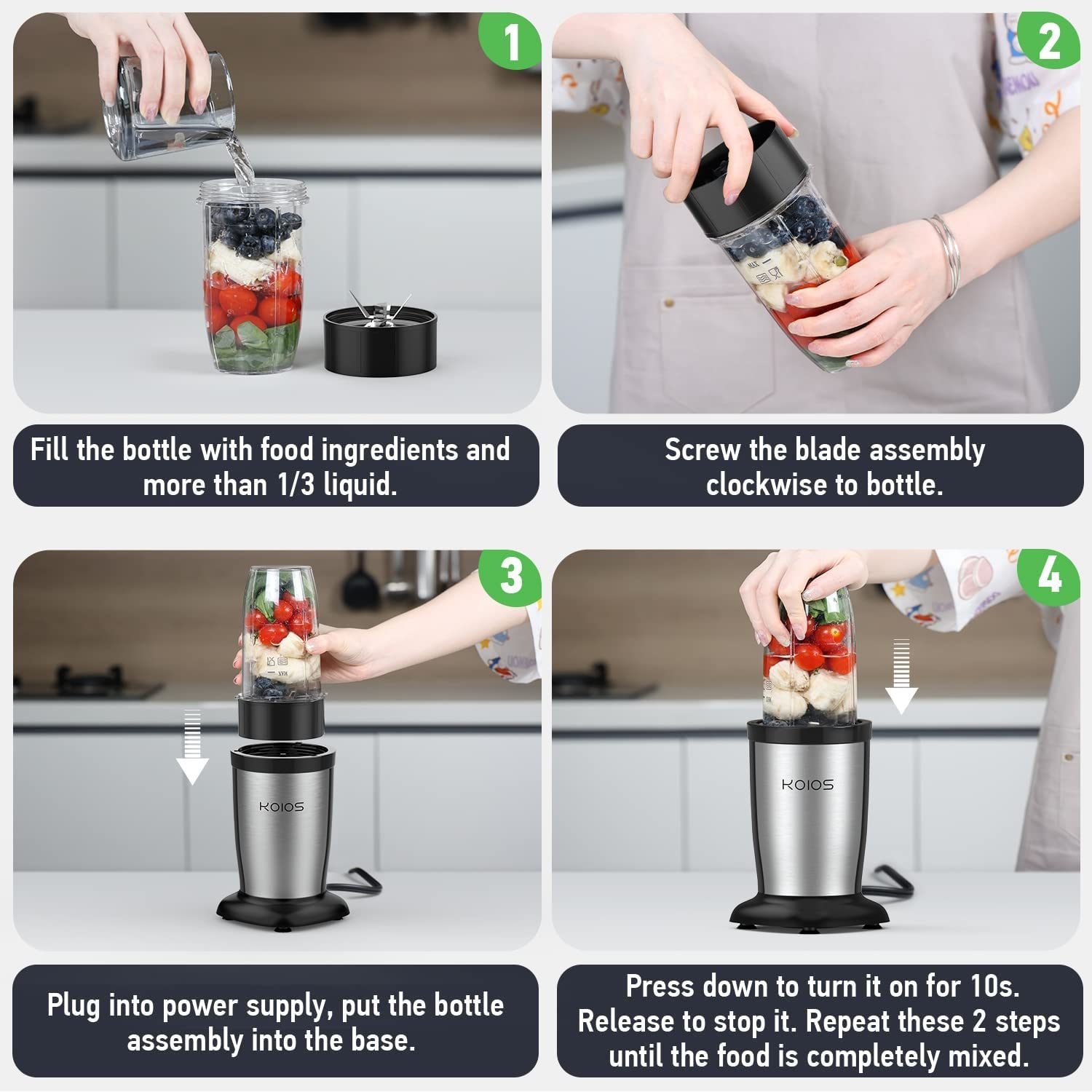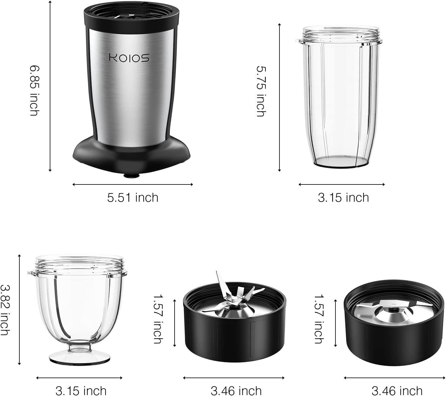 Powerful Personal Blender – 850W copper motor with pulse technology allows your single blender for shakes and smoothies to expand your creativity in the kitchen. Chopping; blending; mixing; grating; pureeing; grinding become quick and simple tasks with KOIOS bullet blender that make cooking more fun.Unlimited Versatility – Make your smoothies; shakes; and juices while traveling; before doing sports in seconds. Easy to get nutrient & vitamin extracts hidden in fruits and veggies. Extra flat blade and cup to grind coffee beans and nuts.Upgraded 304 Stainless Blades – KOIOS bullet smoothie maker & juice blender with 6-leaf cross and flat 2-leaf blades design allows to blend and extract nutrients easily. Turn toughest whole foods into nutritious shakes; smoothies; and nut butter in 10 seconds.Larger Capacity; More Convenient – 2 bullet BPA-free cups with travel lids and a flip-top lid cup turn your healthy drink into the to-go mixed beverage and add extra portability for carrying to the office; gym; or class; in the car; or in your bag. Enjoy tasty & healthy homemade beverages everywhere.Lifetime Support – We provide 24 months exchange guarantee and lifetime technical support. Just try it risk-free! If you have any questions; please feel free to contact us. We will do our best to resolve your problem quickly and effectively.