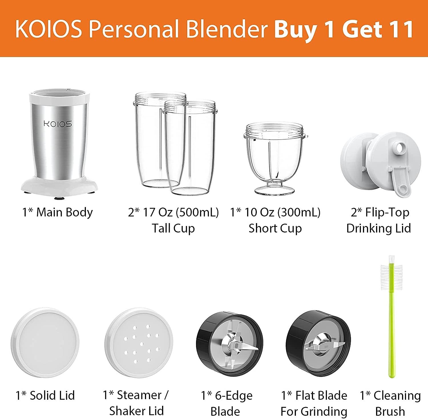 Powerful Personal Blender – 850W copper motor with pulse technology allows your single blender for shakes and smoothies to expand your creativity in the kitchen. Chopping; blending; mixing; grating; pureeing; grinding become quick and simple tasks with KOIOS bullet blender that make cooking more fun.Unlimited Versatility – Make your smoothies; shakes; and juices while traveling; before doing sports in seconds. Easy to get nutrient & vitamin extracts hidden in fruits and veggies. Extra flat blade and cup to grind coffee beans and nuts.Upgraded 304 Stainless Blades – KOIOS bullet smoothie maker & juice blender with 6-leaf cross and flat 2-leaf blades design allows to blend and extract nutrients easily. Turn toughest whole foods into nutritious shakes; smoothies; and nut butter in 10 seconds.Larger Capacity; More Convenient – 2 bullet BPA-free cups with travel lids and a flip-top lid cup turn your healthy drink into the to-go mixed beverage and add extra portability for carrying to the office; gym; or class; in the car; or in your bag. Enjoy tasty & healthy homemade beverages everywhere.Lifetime Support – We provide 24 months exchange guarantee and lifetime technical support. Just try it risk-free! If you have any questions; please feel free to contact us. We will do our best to resolve your problem quickly and effectively.