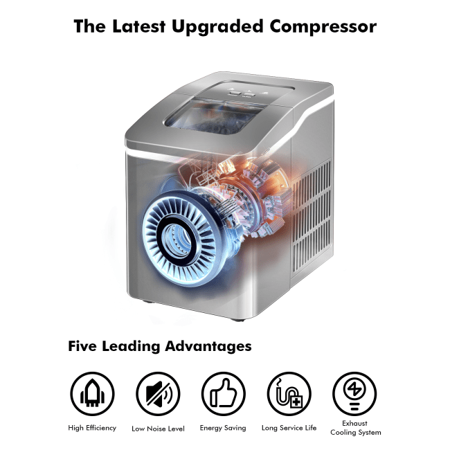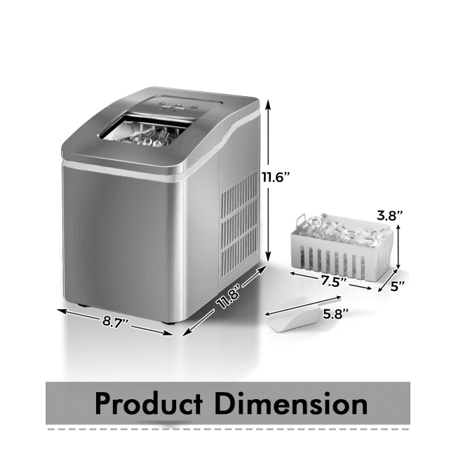Produces 9 chewable bullet-shaped ice in 8 minutes for fast ice-makingMakes 26 lbs of ice each day, meeting your daily ice needsSelf cleaning function maker it convenient to clean and maintainSimple control panel for easy operationFood grade material, harmless to human bodyChecks the progress and amount of ice easily with transparent lidWill not disturb your entertainment with 45dB low noise operationConvenient to carry and store with portable and compact designSuitable for home, office, party and barTakes out the ice with ease thanks to included scoop and removable basketETL and UL certificated for safer use