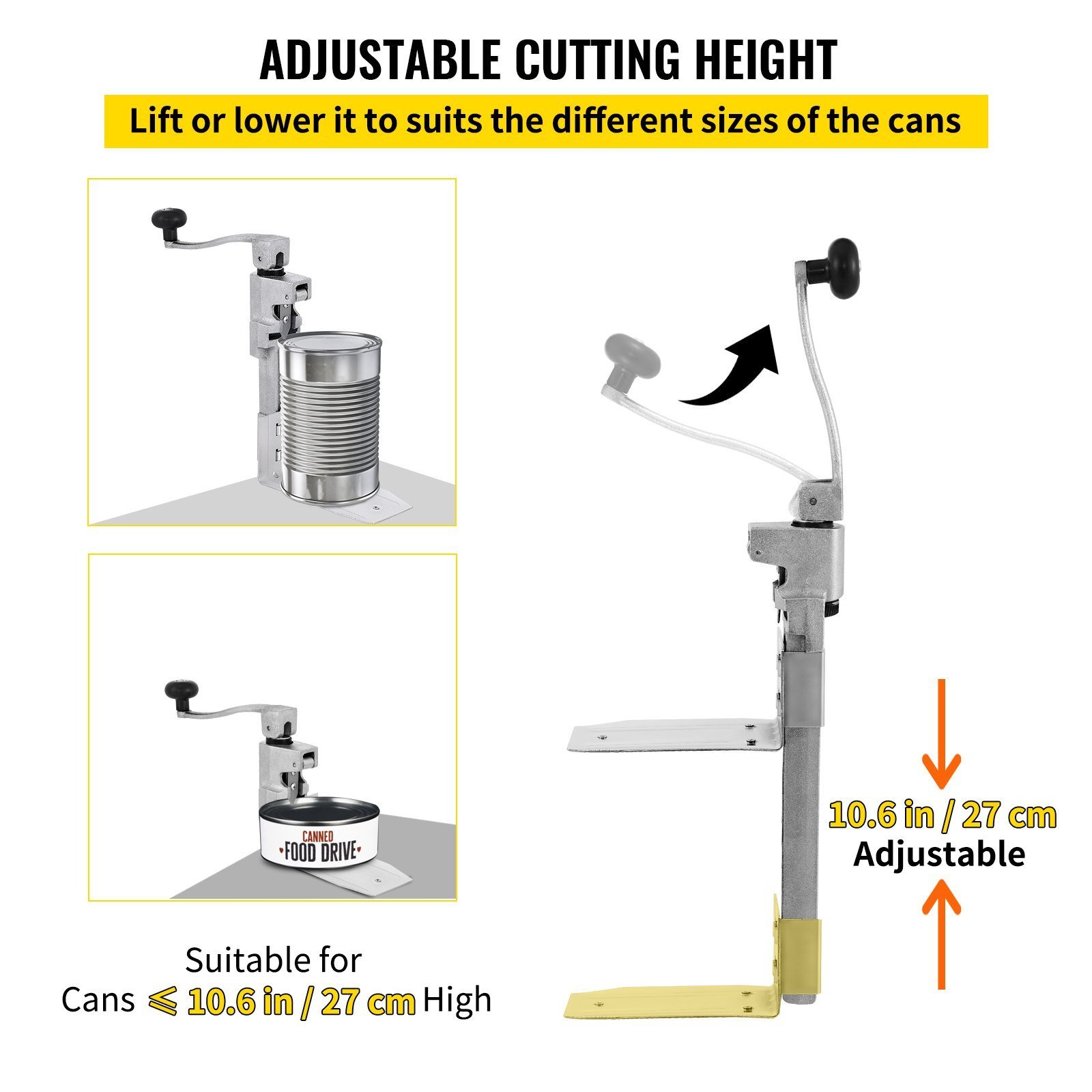 Flexible Height for Various Cans: This table can opener comprises a fixable base and a 10.6 inch / 27 cm long bar. You can freely lift or lower the bar to adjust the cutting height, making it applicable to cans of various sizes. The height adjustment range is 10.6 inch / 27 cm. It is compatible with cans up to 10.6 inch / 27 cm high and 7.7 lbs / 3.5 kg.