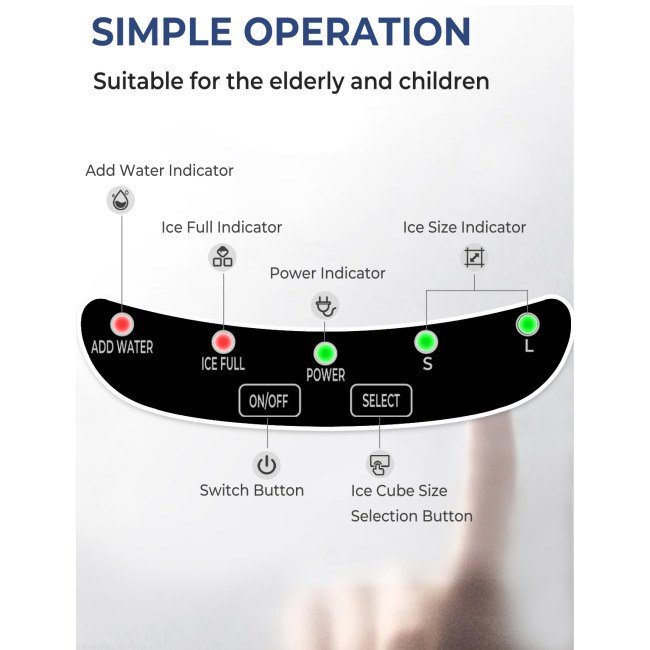 2.Easy Operation Interface and Optional Ice Size: The interface is simple to use and features smart indicators that remind you when the ice basket is full and when the water needs to be refilled. It also allows you to choose from 2 different sizes of ice cubes: small and large.