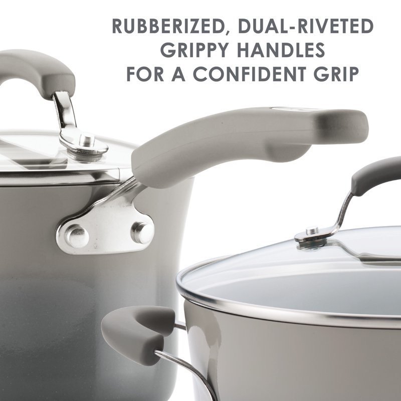 Cooks new and experienced alike will appreciate the essential pieces included in the Classic Brights Hard Enamel Nonstick 15-Piece Cookware Set with bakeware and kitchen tools. Whether your cooking tasks are simmering and searing or browning and baking, cookware gets the kitchen set. From the reliable cooking performance to the fun, contemporary colors and durable materials, the pots and pans in this collection can handle everyone's favorite dishes, and then some. Sturdy aluminum construction promotes even heating, helping to reduce hot spots that can burn foods, and the bold two-tone enamel cookware exteriors show plenty of stylish kitchen personality. hard enamel cookware features durable nonstick interiors that provide beautiful food release and make cleanup snappy. Oven safe to 350F, the cookware's comfortable grippy handles are double riveted for extra strength, and the shatter-resistant glass lids lock in heat and moisture. The cookware comes with two nonstick round cake pans that sport a solid pop of coordinating color and extra-large handles, and are oven safe to 450F. And the cooking tools included – two nonstick-suitable cooking spoons and Rach's clever Veg-A-Peel fruit and vegetable peeler – are smartly-designed so your cooking really cooks! Make, bake and share favorite foods and show off a lot of personality with the bold and contemporary Classic Brights Hard Enamel Nonstick 15-Piece Cookware Set.
