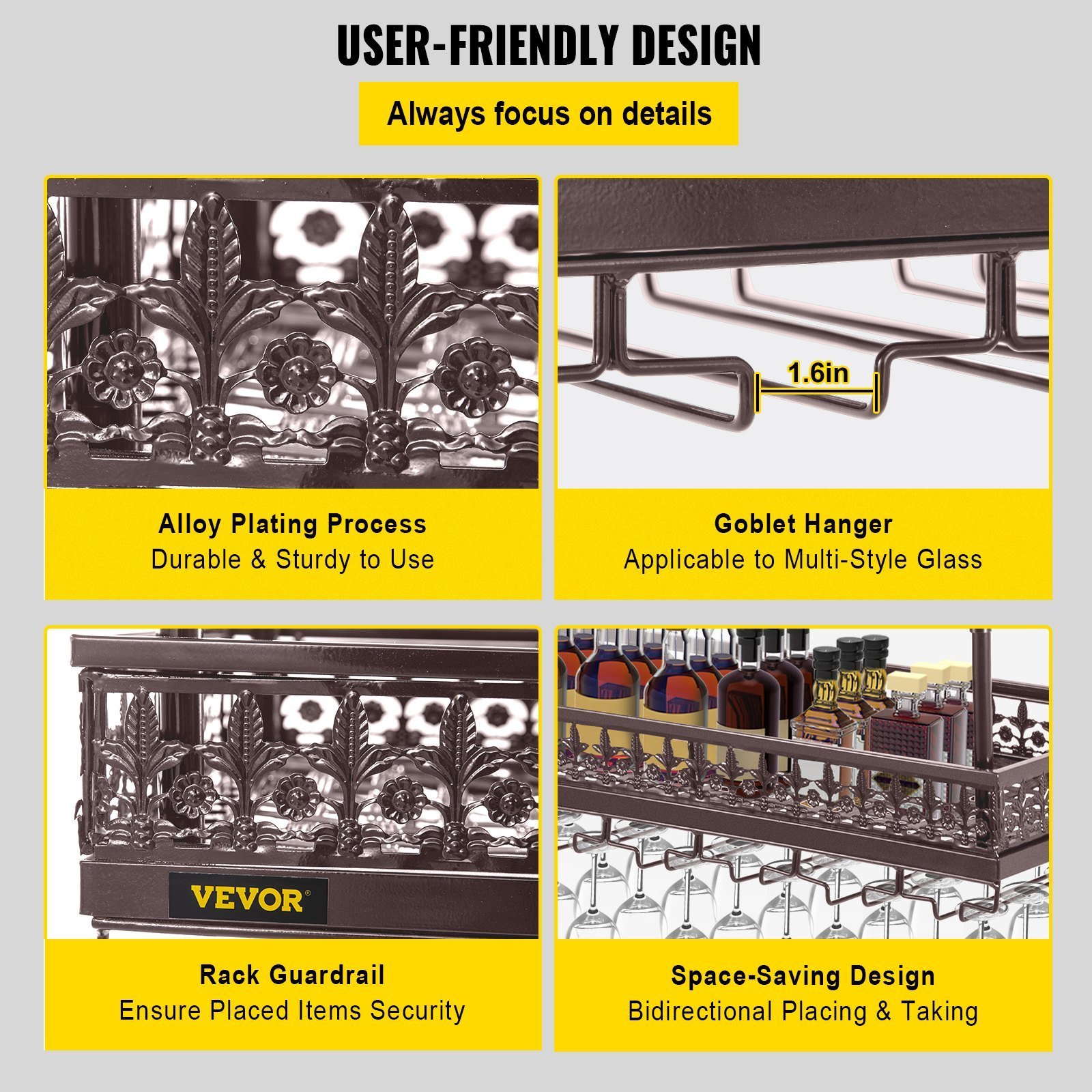 ·Two-in-one Heavy Duty Rack: Our ceiling wine glass rack adopts a multifunctional design. The shelf can be used to store wine bottles, while the bottom hanger is well-designed for holding a maximum of 33 glasses, satisfying your demands in placing plenty of bottles and glasses up to 33 pounds. Besides, the 2 extra offering hooks are perfect for hanging tools like cleaning cloths or bottle openers.·Adjustable Poles: The four poles of our hanging wine glass rack are adjustable in height and width. The height of this rack can be changed from 18.9 to 35.8 inches with 5 gears, and the width between the two poles is adjustable from 3.9 to 10.2 inches, allowing you to make this rack fit your installation space.·Durable Construction: Our wine glass rack uses an alloy plating process, ensuring it's rust-proof, corrosion-proof, and sturdy for use. The bottom hanger has high adaptability, which can hang different types of goblets with more than 1.6-inch base diameter such as wine cups, Bordeaux cups, champagne glasses, etc. In addition, the ceiling-mounted design makes it convenient for you to place and take bottles and glasses in both directions and saves you space.·Convenient Installation: The simplified structure allows you to assemble this wine glass rack effortlessly, saving you a lot of time and energy. It only requires you to install the four poles and the shelf by tightening the screws, and then you need to fix the whole rack to the ceiling through the pre-drilled holes on the top of the poles. After that, our hanging rack is ready to put your wine bottles and glasses.·Versatile Use: Our ceiling-mounted rack is not only suitable for storing wines and bottles at home but also widely applied in commercial scenes such as bars, cafes, hotels, restaurants, commercial cellars, and various high-end clubs. With this rack, you can enjoy a good taste of wine anytime you want.