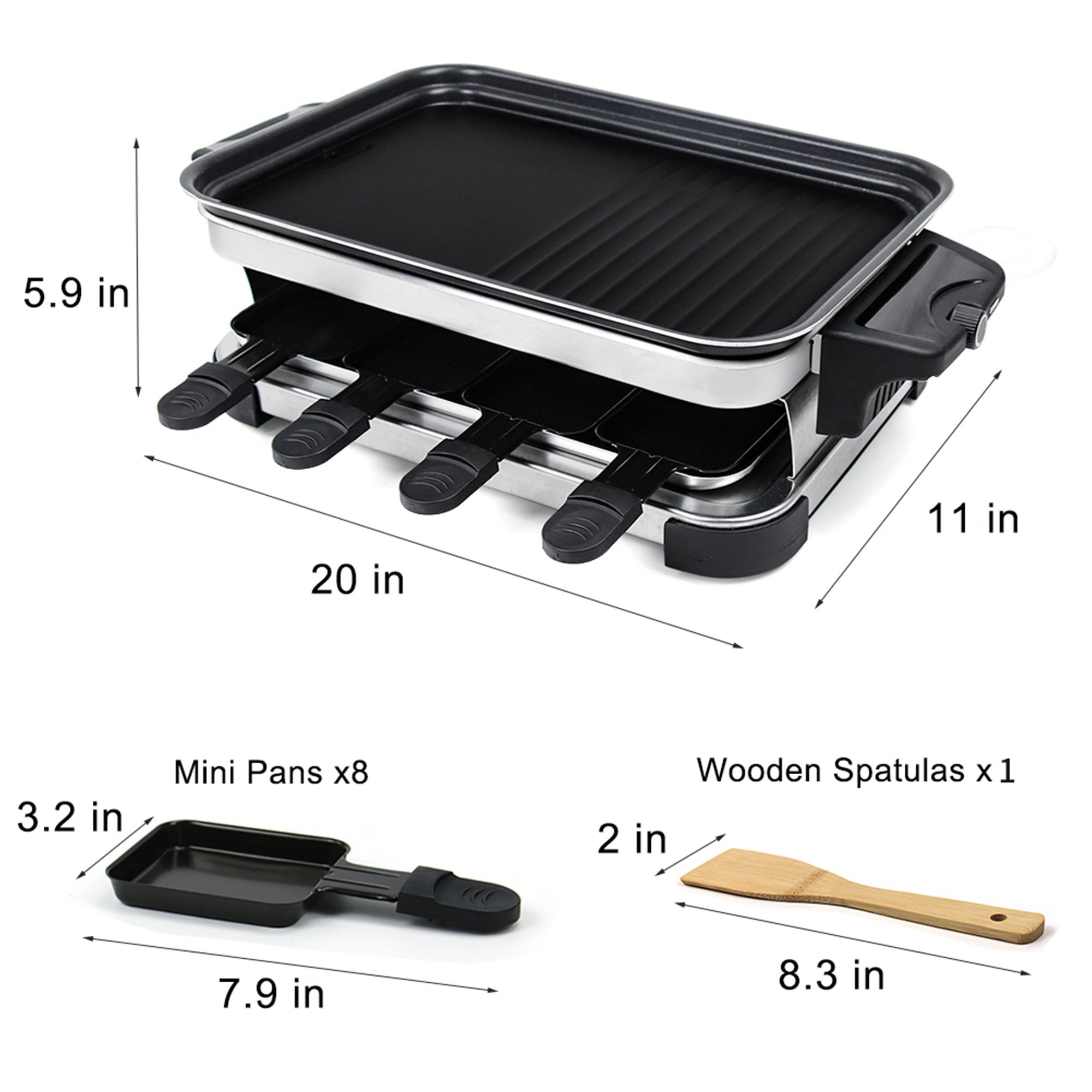 ※ Adjustable temperature control. By using the front knob, you can choose the optimal temperature for your cooking. Intelligent control of temperature at 260 ° C to keep food fresh and nutritious.※ The upper part of the heating device can be easily disassembled for easier cleaning.※ Quick heating. Under a 1300 watt continuous temperature controlled heating plate and a fast heating U-shaped heating tube, cheese, vegetables, etc. can be stored. Gently fry, grill, and melt.※ The non adhesive baking tray has a stepped design, which can effectively prevent oil leakage and keep the pot and table clean. The electric raclette grill is a non stick grill board that only requires a small amount of oil.※Perfect for gatherings. Advanced raclette provides a perfect experience for your gatherings and gatherings. The top is a large aluminum frying pan, and the bottom is 8 mini pots. You can fry or grill food at the same time to adapt to various flavors.