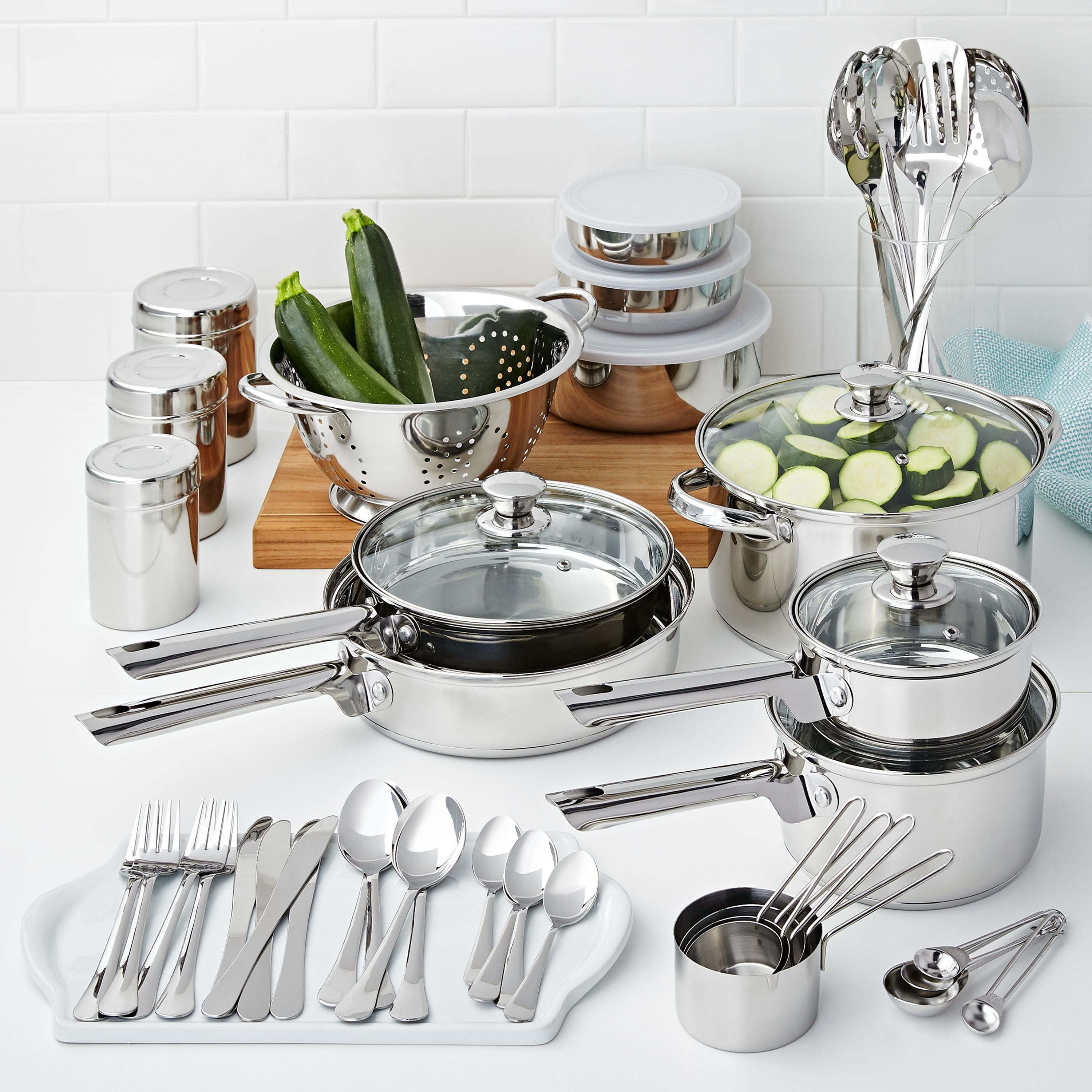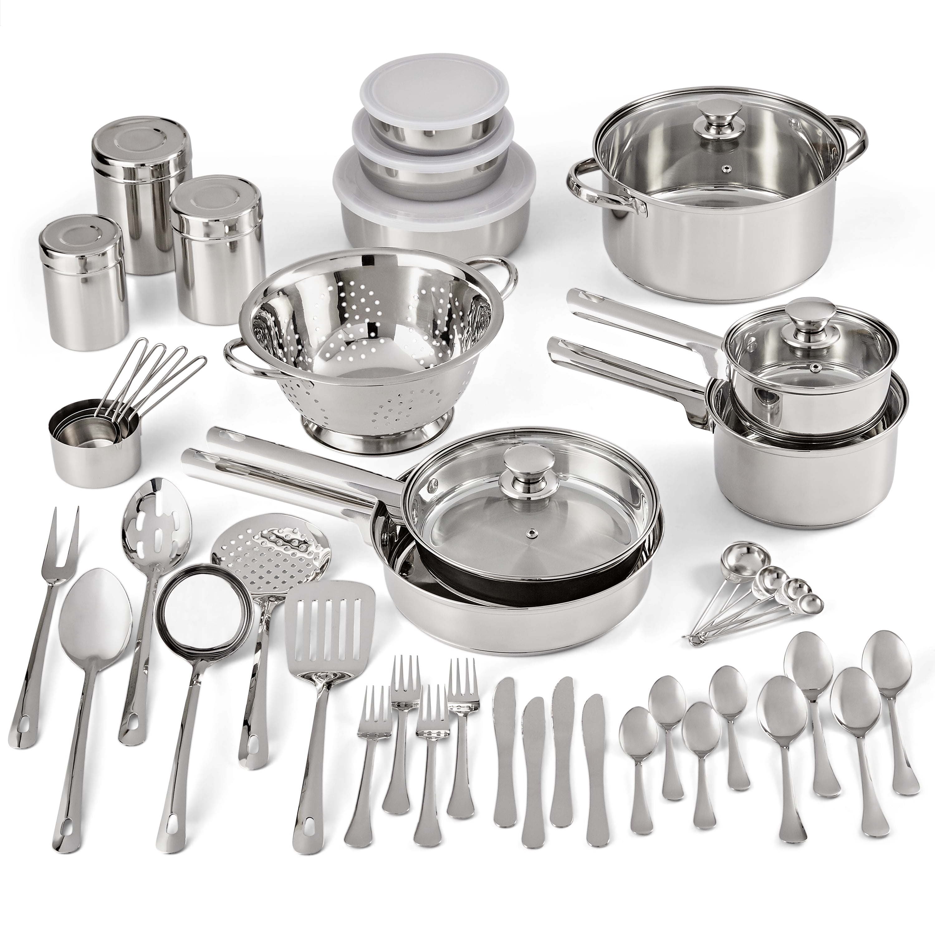 • Set includes an 8.5" sauté pan with glass lid, 10" open sauté pan, 1-quart saucepan with glass lid, 2-quart saucepan with glass lid, 5-quart Dutch oven with glass lid, 3-quart colander strainer, slotted turner, cooking fork, solid spoon, slotted spoon, ladle, skimmer, set of 4 measuring cups, set of 4 measuring spoons, set of 3 storage canisters, set of 3 storage bowls, and 16-piece flatware set (4 each fork, knife, large spoon, small spoon)
