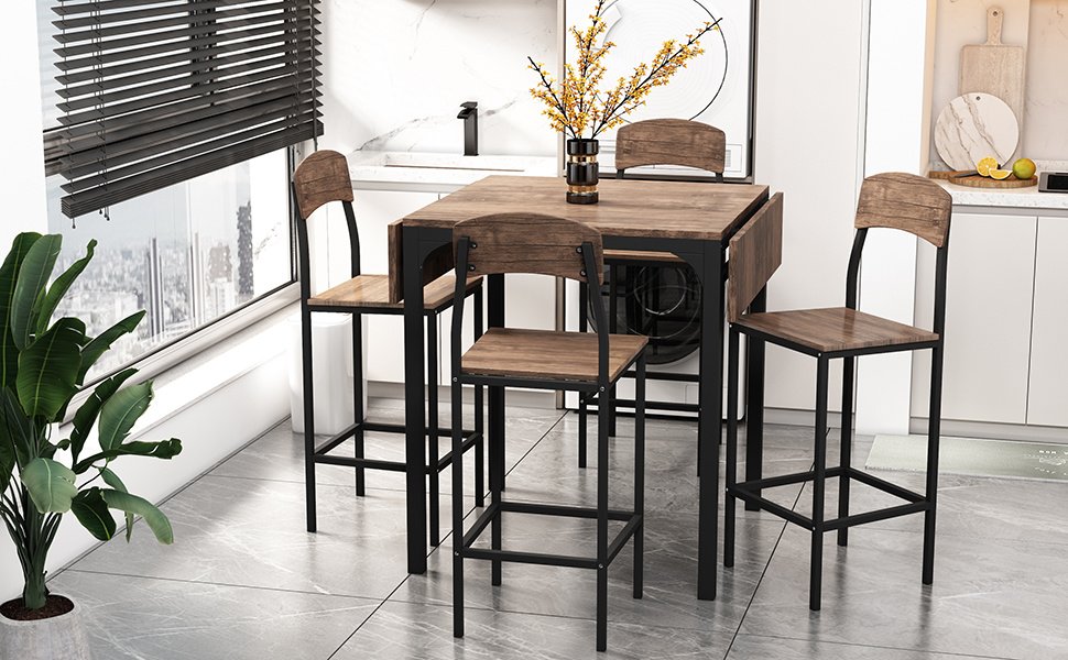 [Counter Height Dining Set for 4] Made of MDF and premium iron frame, this dining set provides a stylish dining space for 4 while keeps long time using. Rich wood grain finish with sleek black frame also creates the perfect contrast, complete with clean lines for a rustic look that complements any kitchen or dining room.