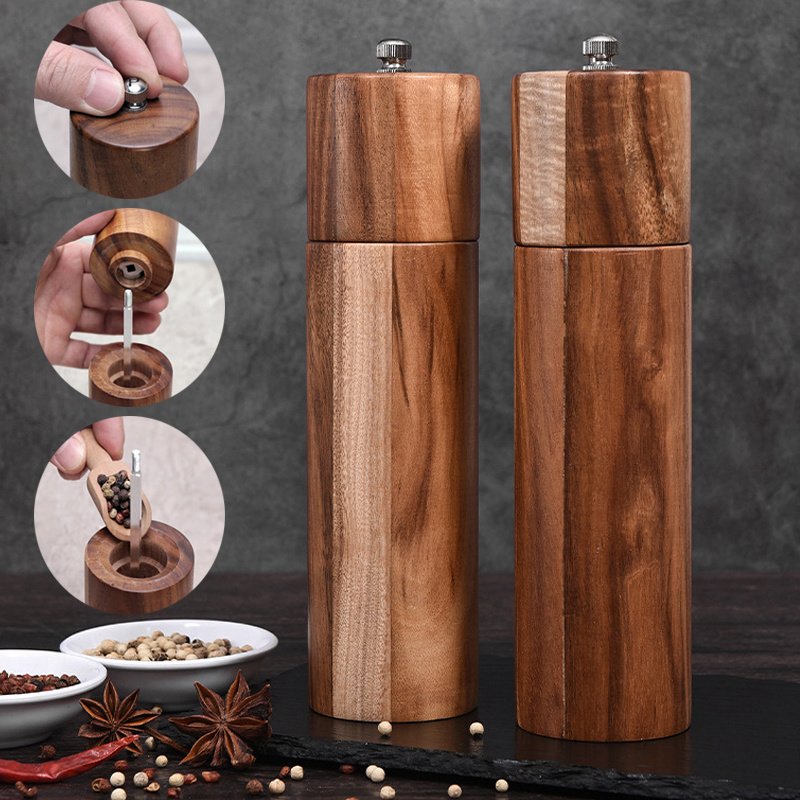 TOP-NOTCH CRAFTSMANSHIP: Our pepper mill grinder and sea salt grinder comprises of acacia wood; naturally creating that desired grain finish that makes this set so exquisite looking. Aside from its beauty; acacia wood is an ideal material because it is incredibly durable and naturally water-resistant; which means it safeguards your salt and pepper from collecting moisture . Built with high-quality stainless steel and ceramic; these containers guarantee flawless performance for years to come.